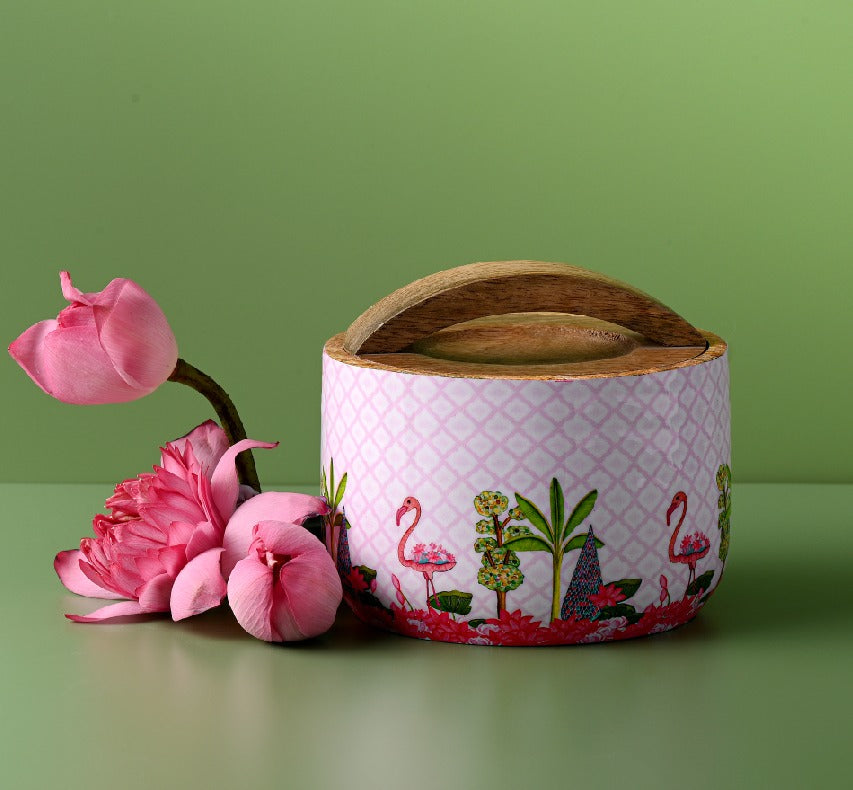 Bring tropical flair to your storage with Flamingo Bloom mango wood jar—where function meets artistry. Hand-turned from sustainably sourced mango wood, each jar showcases the wood’s natural golden grain, offering a warm and organic base. The exterior is wrapped in a glossy enamel finish that bursts with the collection’s signature motif: elegant flamingos, lush palm fronds, and vivid tropical blooms set against a soft geometric pattern. Topped with a wooden lid and a playful, pink-background accent, these jars are perfect for storing sugar cubes, snacks, or small treasures—adding a splash of paradise to your countertop or shelf.