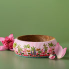 Elevate your table with this exquisite mango wood bowl, a masterful blend of natural craftsmanship and vibrant design. Hand-carved from sustainably sourced mango wood, the bowl’s interior reveals a warm, golden grain—smooth to the touch and rich in character. Its exterior is adorned with a high-gloss enamel finish, showcasing a lush tropical tableau of flamingos, palm fronds, and exotic flora set against a soft geometric backdrop. A playful, pink-striped background adds a refined touch of whimsy.