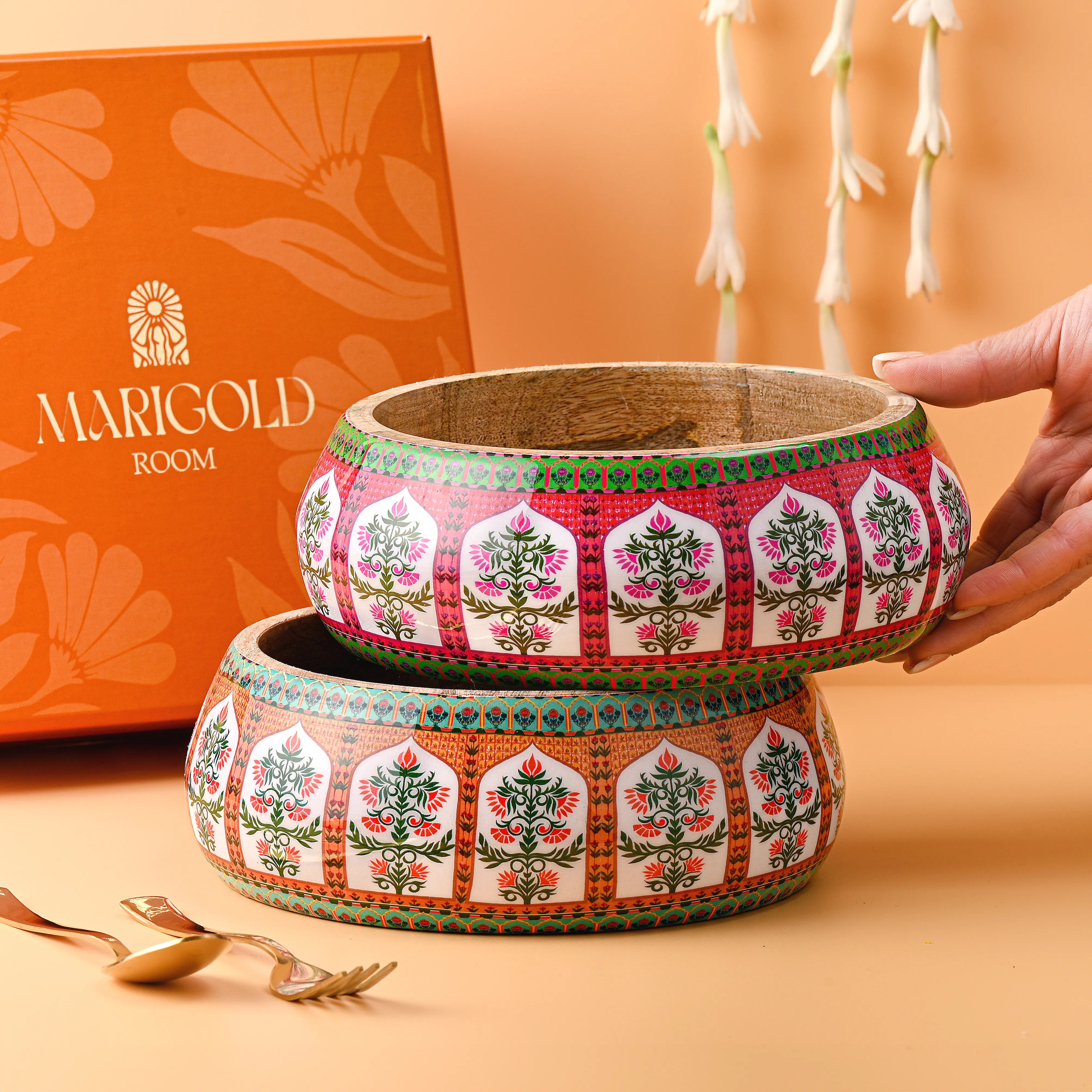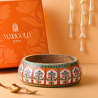 Add a touch of golden luxury to your table with the Saffron Jewel Bowl—a radiant treasure that captures the warmth and opulence of Mughal spice markets. Expertly handcrafted from sustainably sourced mango wood, this intimate bowl showcases a rich saffron-orange finish that evokes the precious spice that once adorned royal kitchens. The perfectly proportioned silhouette makes it ideal for serving appetizers, nuts, or displaying decorative items with regal flair. The exterior features an exquisite enamel finish decorated with authentic Mughal motifs—delicate paisley patterns, ornate florals, and geometric designs that echo the intricate artistry of imperial craftsmen. Golden highlights and meticulous detailing make this bowl a jewel-like accent that transforms any setting into a palace of flavor and beauty.