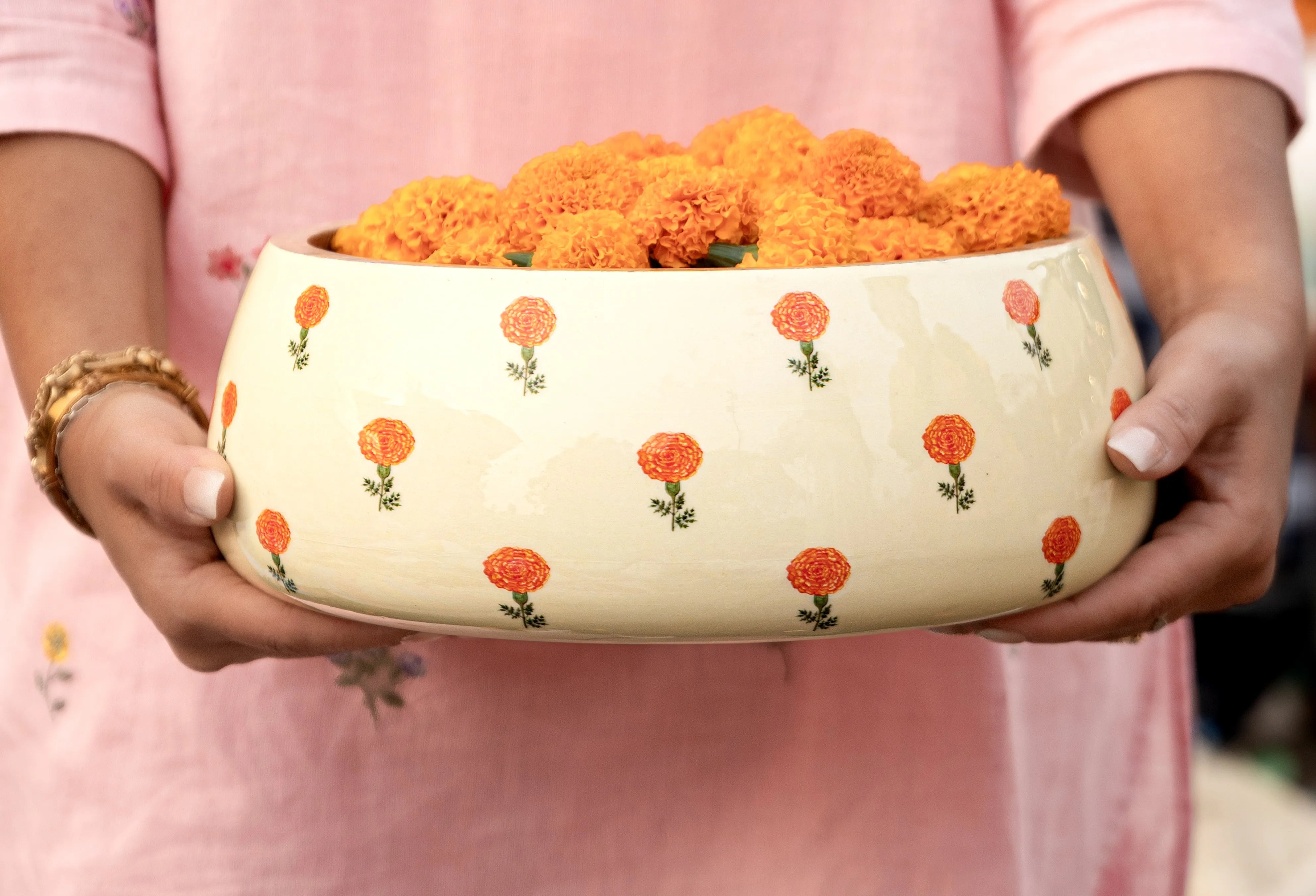 Bring warmth and celebration to your table with the Amber Marigold Bowl—a radiant masterpiece that captures the golden glow of joyful gatherings. Expertly handcrafted from sustainably sourced mango wood, this generous bowl showcases a rich amber-yellow finish that evokes the warmth of candlelight and the richness of autumn harvests. The beautifully curved silhouette provides ample space for serving while maintaining the refined proportions that define elegant entertaining. The exterior features an exquisite enamel finish adorned with festive flower motifs—delicate patterns, celebratory designs, and artistic details that transform every meal into a special occasion. Golden accents and meticulous craftsmanship make this bowl perfect for holiday feasts, dinner parties, or adding a touch of festive warmth to everyday dining.